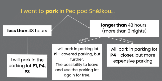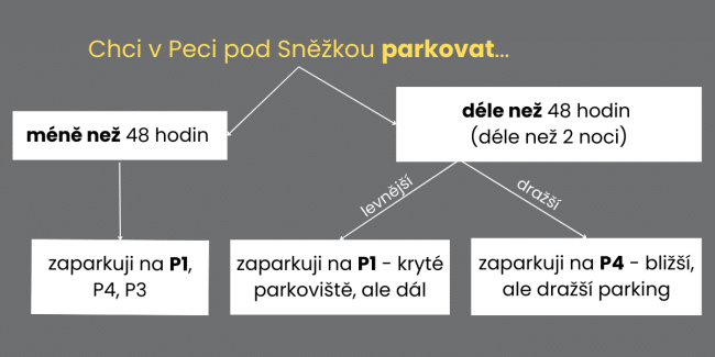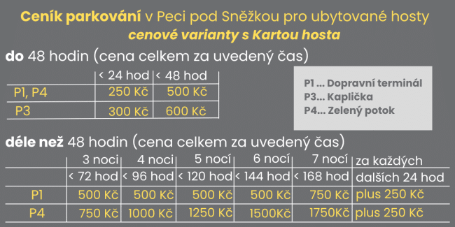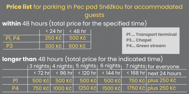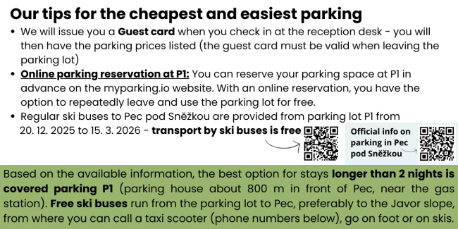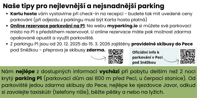 Pokud chcete využívat naše parkoviště u hotelu, vjezd z Pece pod Sněžkou nahoru do lesů (tedy i k nám do hotelu) je možný jen s povolením KRNAP. Dole u centrálního parkoviště uvidíte automat KRNAP, kde toto povolení zakoupíte. V současné době je poplatek pro ubytované hosty (kterými jste) 100,-Kč/ den nebo 200,-Kč/ 2-8 dní.