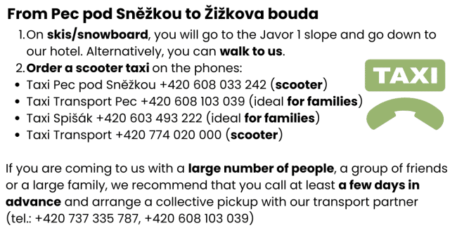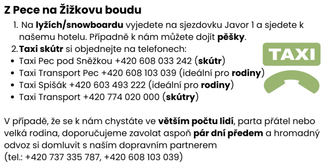 Naše doporučení: Před samotnou cestou se prosím informujte na recepci hotelu (tel.: +420 724 000 033), jestli lze vyjet k našemu hotelu autem (a využít tak naše parkoviště) a nebo je na příjezdové cestě sníh (pak zaparkujete auto na centrálním parkovišti v Peci pod Sněžkou).